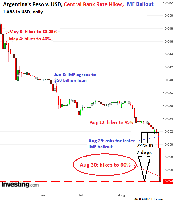 Just when you think Argentina’s financial crisis can’t get worse, it gets a whole lot worse. In order to halt the peso from collapsing further, the IMF, after some serious begging from the government, had agreed to a $50-billion bailout package in June, to be disbursed in increments. In addition, the central bank raised its policy rate in big jumps, reaching 45% on August 13. And in an emergency meeting today, it goosed the rate to a blistering 60%!!