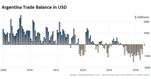 Argentina has to pay for its imports in hard currency. Since it has a trade deficit (more imports than exports) — see the second chart — it needs more dollars to fund this trade deficit. That’s part of the problem. If Argentina had a trade surplus, and a budget surplus, it would not have these problems with its currency and debt.
