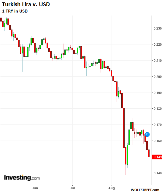 But even if he bites the bullet… Because there’s Argentina: Unlike Turkey, it has bitten that bullet and has just jacked up its policy interest rate to 60% and has agreed to a $50-billion bailout from the IMF in June. And yet its economy is spiraling down and inflation now exceeds 30%. Just when you think Argentina’s financial crisis can’t get worse, it gets a whole lot worse.Read… The Price of Cheap Dollar-Debt: Argentina’s Peso Collapses 24% in 2 Days as Government Begs for Faster IMF Bailout