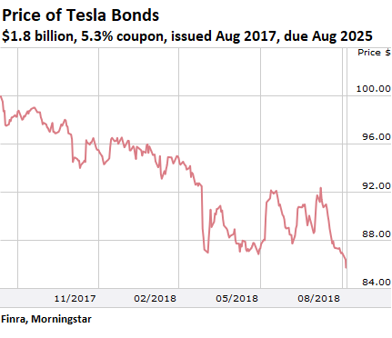 And those bondholders have taken note. The $1.8 billion in senior unsecured notes, due in 2025, that Tesla sold in August 2017 fell to a record low of 85.69 cents on the dollar today. Investors that acquired them at issuance are down over 14%. This chart via FINRA and Morningstar depicts the entire life of those bonds: