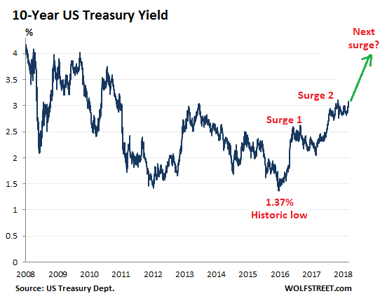 My guess is that the 10-year yield will hit 4% in the first half next year. I would consider this “normal” and “to be expected” in this rate hike cycle, not a “spike.” It would perfectly fit into my chart below from two weeks ago, which shows how the 10-year yield moves in surges, rather than in a smooth-ish line. We already started the third surge this week, it seems, with the 10-year yield at 3.2%: