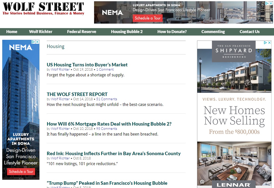 This is hilarious: I just clicked on the “Housing Bubble 2” tab in the menu above (it has all my articles on housing in the US), and when the page rendered it showed three ads for brand-new luxury apartment and condo projects in San Francisco, where I live, a city now drowning in overpriced luxury apartments and condos. Sign of desperation?