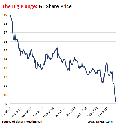 Wolf here: Shares of General Electric [GE] are down over 3% this beautiful Friday morning, trading at $9.20. If they close at this level, they would mark a new nine-year closing low. Shares are down 52% year-to-date: