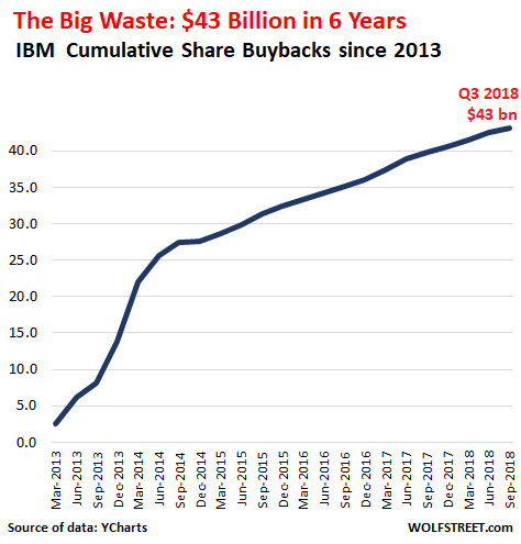 Let’s take a gander at International Business Machines [IBM], one of the biggest share buyback queens. Since 2000, it blew $146 billion on share buybacks. The chart below shows the cumulative amounts since 2013 that IBM wasted on share buybacks: $43 billion (data via YCharts):