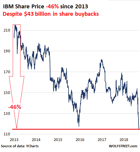 Wall Street gurus keep hyping that share buybacks “unlock shareholder value,” or “return cash to shareholders,” or some such thing. But here’s what IBM’s share buybacks did to shareholder value, as measured by the stock price: