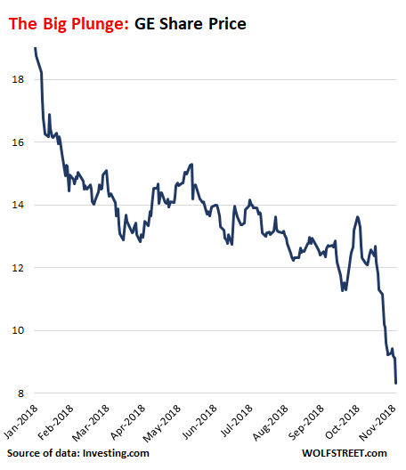 GE shares plunged another 10% this morning to a low of $8.15 before recovering a little. They’re now a big step closer to the Financial Criss low of $6.66, which had been the lowest since the early 1990s. And for most of the year, retail investors – as measured by clients of TD Ameritrade – were net buyers of GE and bought the dips, lured by the Wall Street siren song of a “buying opportunity” and a fat dividend yield.