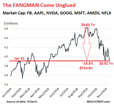 In terms of dollars, the FANGMAN stocks have lost $710 billion from their combined market cap peak on August 31, having plunged 15.3% from $4.63 trillion to $3.92 trillion (data via YCharts).