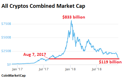 This chart via CoinMarketCap shows the drama of bitcoin’s market cap surge to $333 billion on December 17, 2017 and the collapse to $64.9 billion now:
