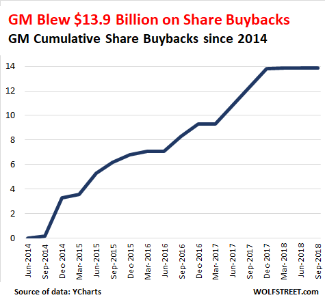 During this four-year period in which GM blew, wasted, and annihilated nearly $14 billion on share buybacks, the price of its shares, including today’s 5.5% surge – getting rid of workers is always good news for shares – fell 10%.
