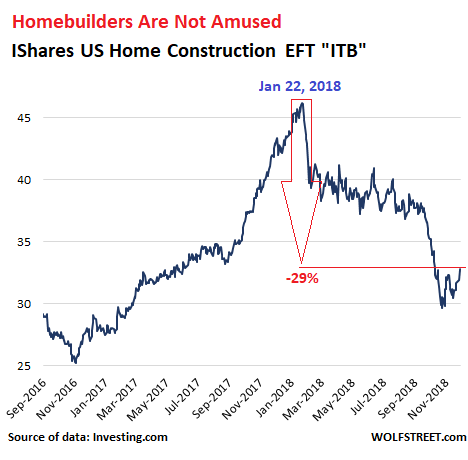 Since January 22, the iShares US Home Construction ETF [ITB] — top holdings are the homebuilders Lennar, D.R. Horton, NVR, PulteGroup, and Toll Brothers — has plunged 29% despite the blistering 2.7% bounce today: