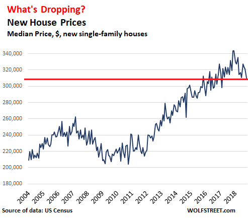 The median sale price of new single-family houses sold in October dropped 6.6% from a year ago to $309,700, the lowest since February 2017, and a price that was first reached in November 2015. Granted, this data is whiplash-volatile, but after a while the trend becomes clear: