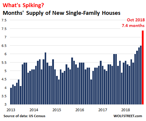 With an inventory of new houses for sale at 336,000 (seasonally adjusted), the supply at the current rate of sales spiked to 7.4 months, from 6.5 months’ supply in September, and from 5.6 months’ supply a year ago. Suddenly gone is the previously hyped “shortage” of inventory: