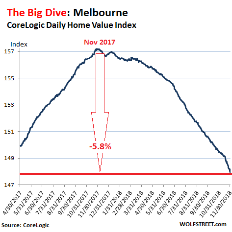 Greater Melbourne, the second largest housing market in Australia, has been lagging behind Sydney by a couple of months in the development of its housing bust. Its peak occurred in November 2017. But by now, the bust is well on its way. According to the CoreLogic Daily Home Value Index: