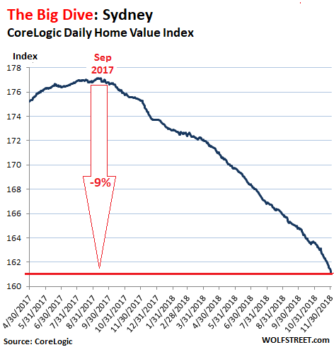 The overall index for Sydney, after dropping 1.4% from the end of October to the end of November, is now down 9.0% from its peak in September last year: