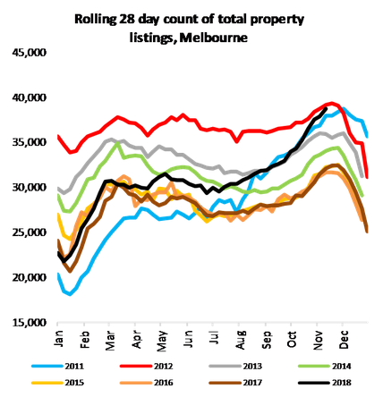 While new listings in Melbourne fell 5.6% from a year ago, to 9,714, as potential sellers are holding back putting their properties on the market in hopes for better times, total listings jumped 19.3% from a year ago to 38,730, the highest level since 2012, and higher than 2011 — highlighting “the difficulty in achieving sales currently,” CoreLogic pointed out (the black = 2018, chart via CoreLogic):