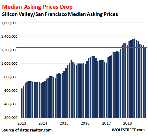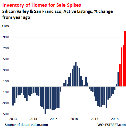 It’s high time to unload houses and condos in Silicon Valley and San Francisco, one of the most expensive housing markets in the US. Sellers are now flooding the market with properties. Inventory listed for sale in those three counties that make up the area – San Francisco, San Mateo, and Santa Clara – surged by 102% in November compared to November last year, to 3,931 listings.
