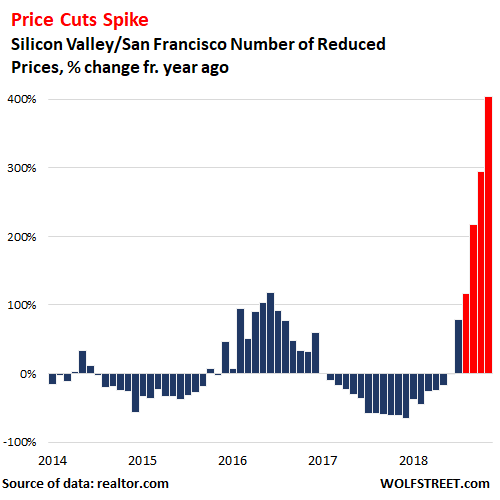The chart of the year-over-year percentage changes in price cuts in Silicon Valley and San Francisco shows that the change of direction in the market occurred around August. By September, price cuts hit the highest level since Housing Bust 1: