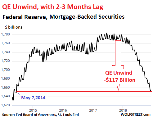 And this is how it panned out. From November 1 through today’s balance sheet, the balance of MBS fell by $16 billion, to $1,653 billion, the lowest since May 7, 2014. Since the beginning of the QE unwind, the Fed has whittled down its holdings of MBS by $117 billion: