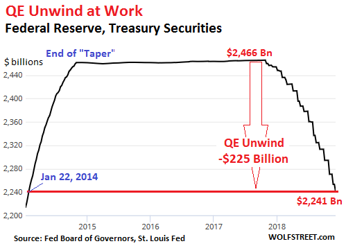 From November 1 through December 5, the Fed’s holdings of Treasury Securities fell by $30 billion to $2,241 billion, the lowest since January 22, 2014. Since the beginning of the QE-Unwind, the Fed has shed $225 billion in Treasuries:
