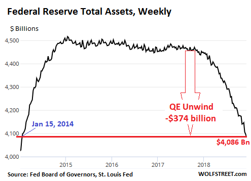 The Federal Reserve shed $54 billion in assets over the five weekly balance sheet periods that encompass the calendar month of November. This reduced the assets on its balance sheet to $4,086 billion, the lowest since January 15, 2014, according to the Fed’s balance sheet for the week ended December 5, released this afternoon. Since the beginning of the QE unwind — or “balance sheet normalization,” as the Fed calls it — in October 2017, the Fed has now shed $374 billion:
