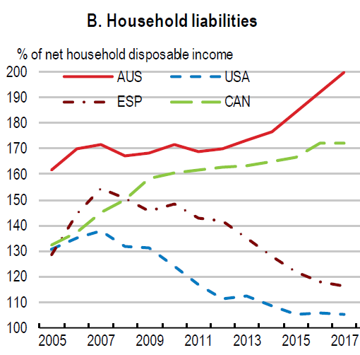 Australia’s household indebtedness, mostly tied to mortgages, and mostly owed to the above big four banks, reached 200% of net household disposable income, the highest ratio in the world. Even Canadian households can’t keep up with that. And US households, after the Financial Crisis, just fell of the mortgage wagon: