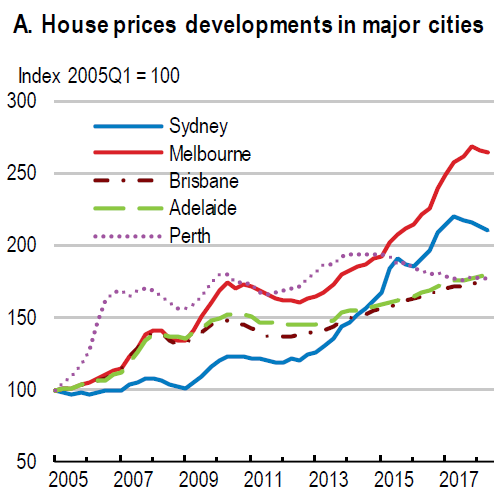 The OECD’s chart below depicts house prices in the big five capital cities. House prices in Perth (dotted line) have been in decline since 2014 due to the mining bust: