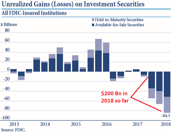 Note the damage done in 2018, after years of big gains: $83.4 billion in Q3; $66.4 billion in Q2; and about $55 billion in Q1; for a total so far this year about $200 billion in unrealized losses.