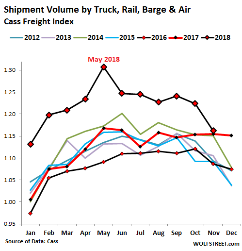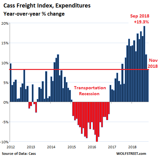 And growth of demand for transportation is now stalling. Freight shipment volume across all modes of transportation – truck, rail, air, and barge – was essentially flat in November compared to November 2017, and about flat with November 2014 (the other recent banner year), according to the Cass Freight Index. This year-over-year no-growth is down from growth in the double-digits earlier this year. The index covers merchandise for the consumer and industrial economy but does not include bulk commodities, such as grains or chemicals: