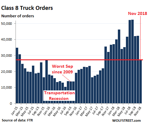 - The effects of the “transportation recession” on Class-8 truck orders in 2015 and 2016 when orders collapsed to the lowest level since 2009, triggering layoffs at truck and engine makers;