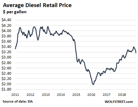 The average price of diesel at the pump, according to EIA data, has been edging back down ever so reluctantly from the cycle peak in October ($3.40 a gallon), despite the 30% plunge in the price of crude oil since then. At $3.16 a gallon, the average retail price of diesel is still up 8.6% from a year ago: