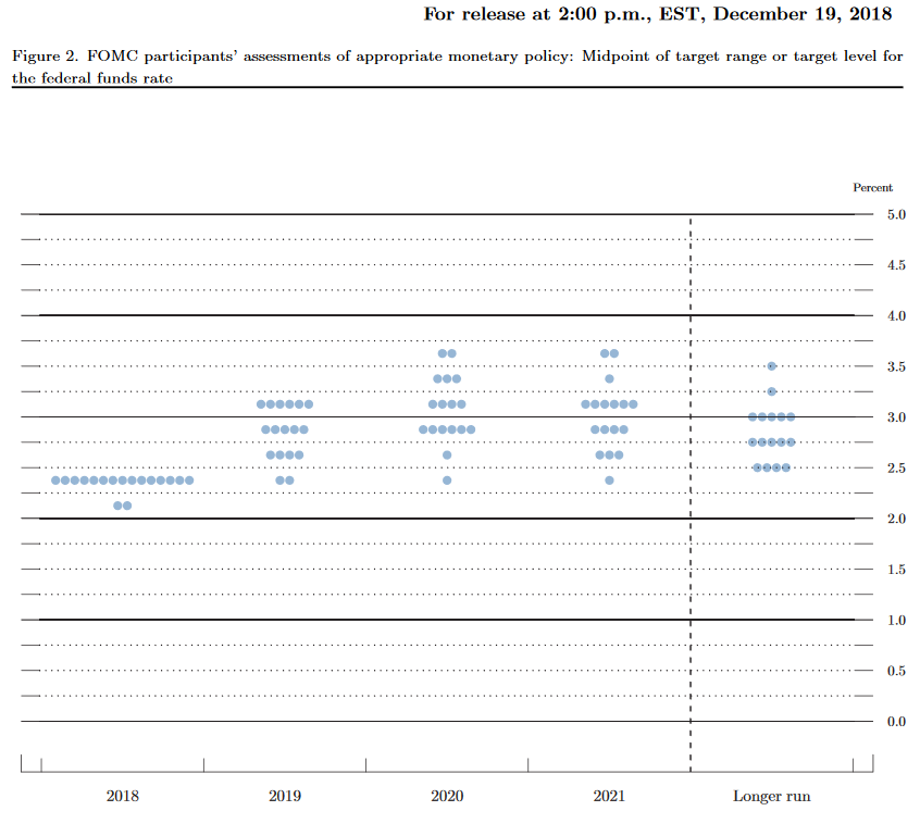 But here is the thing: A year ago, at the December 2017 meeting, the FOMC’s median projection for the federal funds rate at the end of 2018 was 2.1%. In other words, a year ago, they projected three rate hikes in 2018; and in 2018 they voted for four rate hikes — each time unanimously!