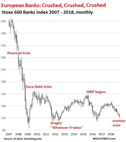 But going back a decade, this 33% plunge is just a dimple, compared to the epic 75% collapse since the European bank peak in 2007 that rivals the Nasdaq-collapse of 78% in 2001-2003. The Nasdaq has more than recovered, while the European banks are just bumping along from hopeless to hope and back to hopeless: