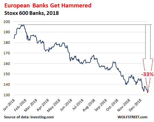 Today the stocks of European banks, as depicted by the Stoxx 600 Banks index, dropped 2.5%. The index has plunged 33% from its 52-week high in January: