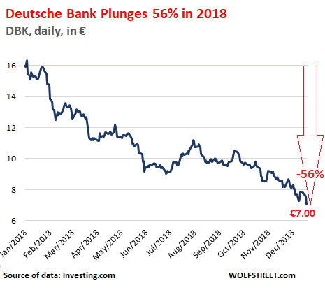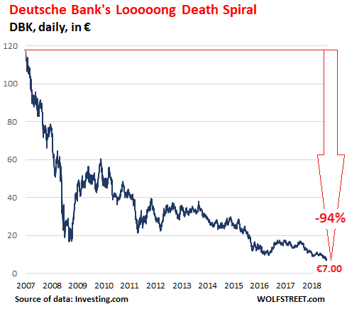 It just doesn’t let up with Deutsche Bank — or with European banks in general. A new day, a new scandal, a new historic low in the share price that has been in a death-spiral for over 10 years. Deutsche Bank shares plunged 7% today in Frankfurt, to a new historic low of €7.00, after briefly threatening to close at an ignominious €6.99. Its market cap is now down to just €14 billion. The stock has plunged 56% so far this year: