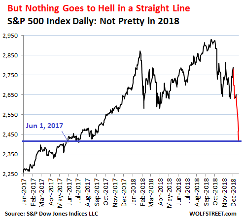 The Nasdaq dropped 8.4% this week to 6,573, and is down 8.3% year to date. “Nasdaq 5000” not yet. But those who promised us Nasdaq 10,000 will have to be patient, very patient. The Nasdaq is down 22% from its peak at the end of August, and is back where it had last been in September 2017.