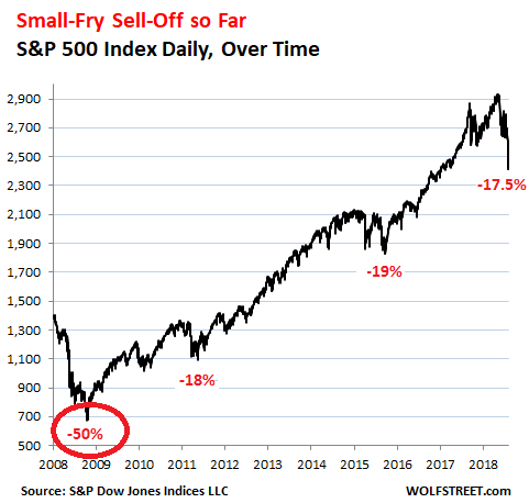 The long-term chart puts this into perspective: The nine-year surge has been so huge that the current sell-off doesn’t really measure up, especially not compared to the last major sell-off during which the S&P 500 dropped by about 50%: