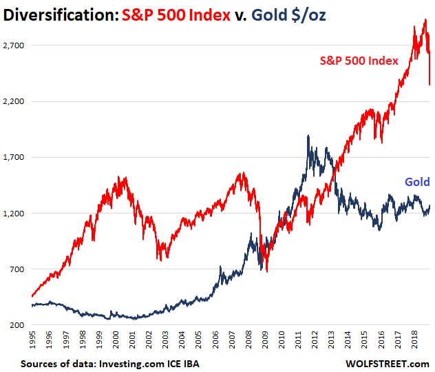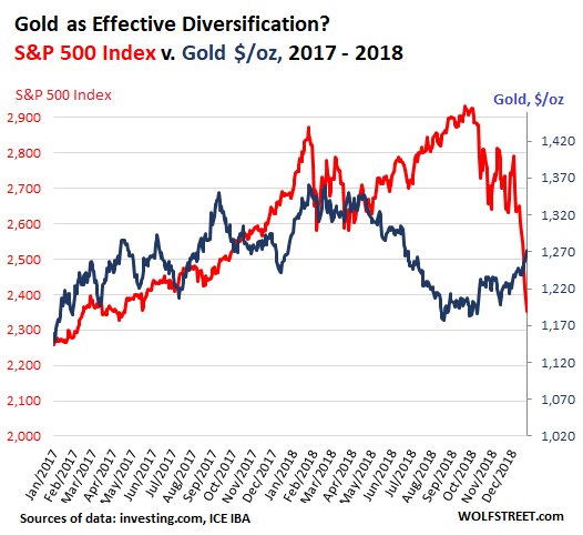 For the year so far, the S&P 500 index is down 12.1%, gold is down 1.6%. For the past two years, the S&P 500, despite the huge volatility, is up 4.2%, and gold, also with some volatility, is up 9.7%. Moving in the same direction over these time frames, gold has been somewhat less effective as diversification, than it has been over the past three months. But as the chart below shows, its moves were not in lockstep with the S&P 500, and thus gold has helped counter-balance the erratic gyrations of the S&P 500 with its own erratic but different gyrations. Diversification can be messy: