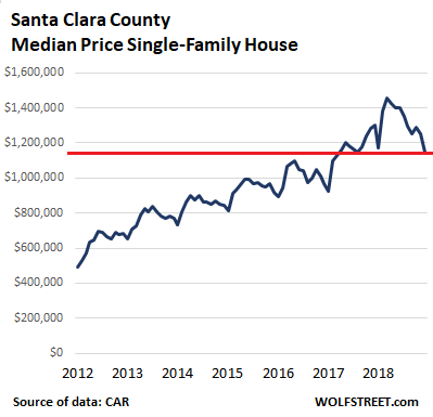 Booming? Home prices in Santa Clara County took a big dive. For example, median price single-family house down 11.5% in December year-over-year, and back where it had first been in April 2017, according to the California Realtors Association: