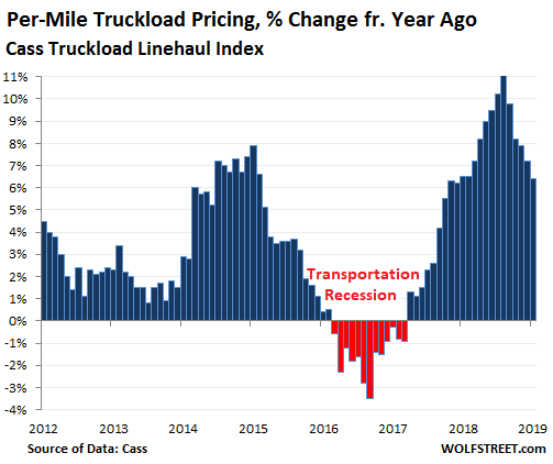 Rising capacity and declining shipments, no problem: Freight rates continue to surge. In January, the Cass Truckload Linehaul Index, which tracks per-mile full-truckload pricing and does not include fuel or fuel surcharges, rose 6.4% compared to January 2018. But that year-over-year increase in truckload pricing is backing off from the double-digit spikes last summer: