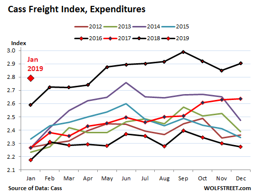 In terms of overall expenditures for freight: For all modes of transportation combined – truck, rail, air, and barge – shippers spent 7.8% more in January to get their goods delivered than they’d spent a year ago, despite the decline in shipments, according to the Cass Freight Index for Expenditures. This increase in freight spending was caused by the continued though somewhat slower price inflation in transportation services.