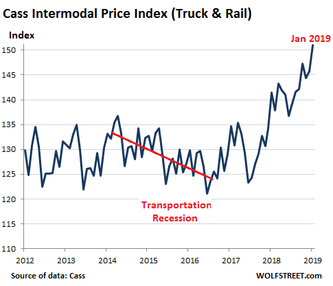 Intermodal freight in the US is a combination of truck and rail, such as containers hauled by truck and then transferred to rail, or semi-truck trailers that piggyback on special rail cars. The chart below shows the blistering price increases in 2018 and continuing through January 2019, even as fuel prices are faltering: