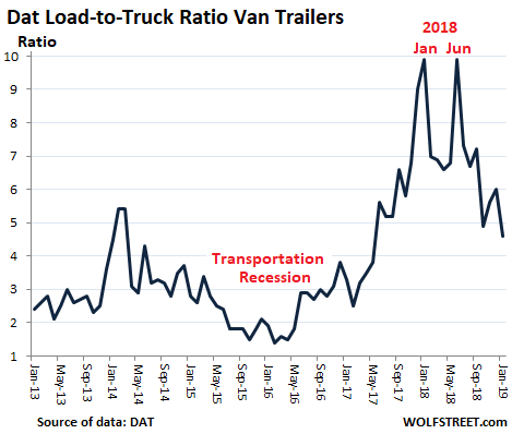 And given the rising capacity, and the declining shipments, trucking companies have backed off their historic binge of ordering Class-8 trucks. In January, orders for these trucks plunged by 58% from a year ago, to the lowest level since October 2016, toward the end of the “transportation recession” when Class-8 truck orders had plunged to the lowest levels since 2009, and truck and engine manufacturers responded with layoffs. So that U-turn was fast, even for the legendarily cyclical trucking business. Read… Phenomenal Trucking Boom Ends, Trucking Bust Starts