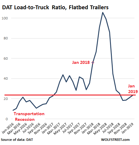 A good portion of the equipment and supplies for the industrial sector – manufacturing, oil & gas drilling, construction, mining, etc. – is transported by flatbed trailers. Demand for flatbed trailers skyrocketed in early 2018 as capacity suddenly tightened under the pressure that ELDs put on the industry, while demand was strong. DAT’s Load-to-Truck ratio experienced a historic spike from January through April 2018, then reverted to the mean and overshot the mean on the way down: