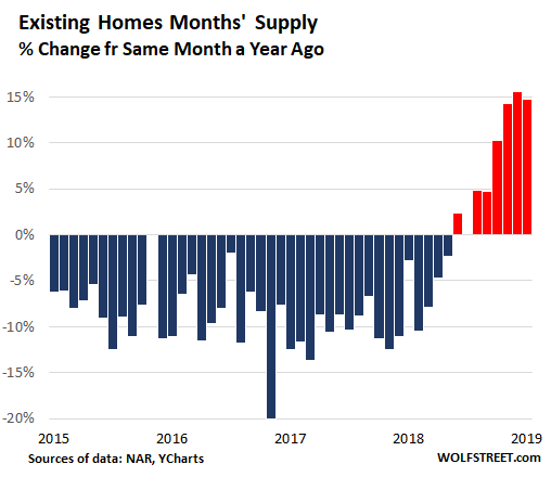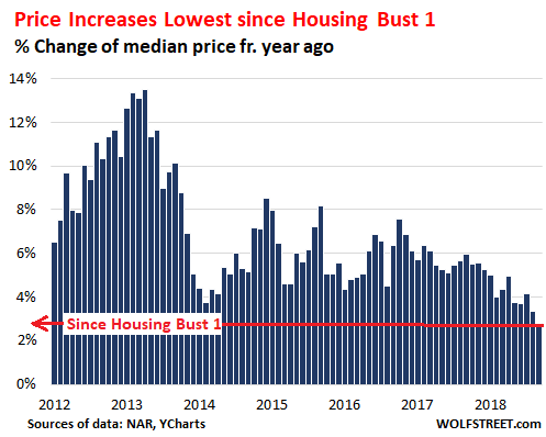 The market, if it’s allowed to, can fix the affordability problem that exists in many cities in the US by finding price levels were first-time buyers can afford to buy a home with the income they’re making. At its glacial pace, this is starting to happen in some markets, with sales volume dropping, and inventories rising, and sellers having to step down the aspirational ladder to make deals. In some of these markets, price levels have a long way to go before they make sense, where a household with a median income on the local scale can afford a median home. And there are now enough local housing markets that have turned south to where the impact is starting to creep into national averages.