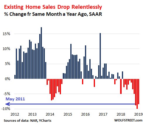 Sales of “existing homes” – single-family houses, townhouses, condos, and co-ops – across the US in January dropped 8.5% from a year earlier, to a seasonally adjusted annual rate (SAAR) of 4.94 million homes, according to the National Association of Realtors, after having dropped 10.1% year-over-year in December and 8.9% in November. All three were the biggest year-over-year drops since May 2011, during the final throes of Housing Bust 1 (data via YCharts):