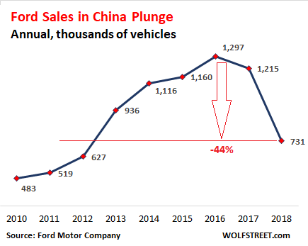 Ford’s annual sales through its joint ventures in China – by far the largest auto market in the world where GM sells more vehicles than in the US – peaked in 2016 at 1.297 million vehicles, according to Ford’s 10-K. But in 2018, Ford sold only 731,000 vehicles. A two-year plunge of 44%.