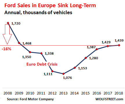 When the Eurozone went through the Financial Crisis and its subsequent Euro Debt Crisis, Ford’s sales plunged 37% between 2008 and 2013. Then they recovered. In 2018, sales rose to 1.44 million vehicles. Quite a feat for a company whose global sales are swooning. But those 2018 sales were still down 16% from 2008: