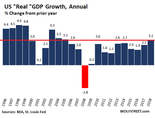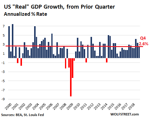 So the dreams of 3%-plus economic growth in 2018 were fulfilled, after tax cuts and ballooning federal deficit spending, which acted as a huge stimulus: In the fourth quarter, the economy as measured by inflation-adjusted GDP grew by 0.55% from the third quarter, not annualized (we’ll get to the “annualized rate” in a moment).