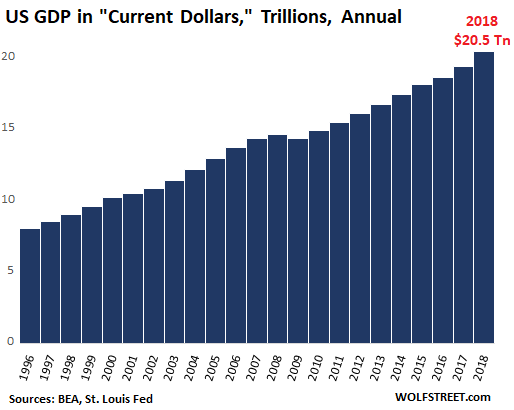 So this dollar measure of GDP is incomplete. Nevertheless, nominal GDP, not including services such as prostitution and goods such as narcotics, increased in 2018 by $1.0 trillion to reach $20.5 trillion in today’s dollars: