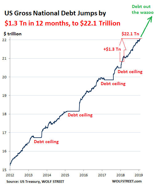 In the calendar year 2018, the federal government’s debt grew by $1.4 trillion, to end the year at $21.97 trillion. If you exclude the distortive effects of the last debt-ceiling fight, the increase in 2018 comes to around $1.3 trillion.